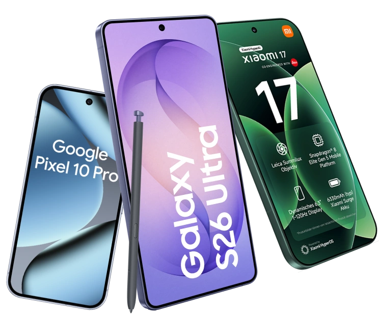 Bei 1&1 erhalten Sie auf Wunsch aktuelle Top-Smartphones schon ab 0,– € und genießen zusammen mit den Leistungen aus Ihrem jeweiligen Tarif ein Rundum-sorglos-Paket. Mit einem Vertrag sichern Sie sich die brandneuen Handys wie z.B. das Samsung Galaxy S26 mit Vertrag oder iPhone 17 mit Vertrag bereits kurz nach der Veröffentlichung zu einem attraktiven Preis. Bei 1&1 als Ihrem Anbieter erwarten Sie alle bekannten Hersteller und stets die neuesten Modelle von