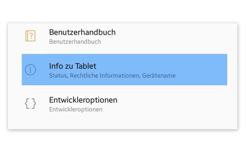 Scrollen Sie bis ans Ende der Einstellungen. Tippen Sie dafür in die Mitte Ihres Bildschirms und wischen Sie mit dem Finger nach oben. Führen Sie diesen Schritt so lange durch, bis Sie am Ende der Seite angelangt sind. Tippen Sie nun auf "Info zu Tablet" oder "Tabletinfo" (der Name der Option kann von Hersteller zu Hersteller variieren, es ist jedoch in den meisten Fällen die letzte Option).