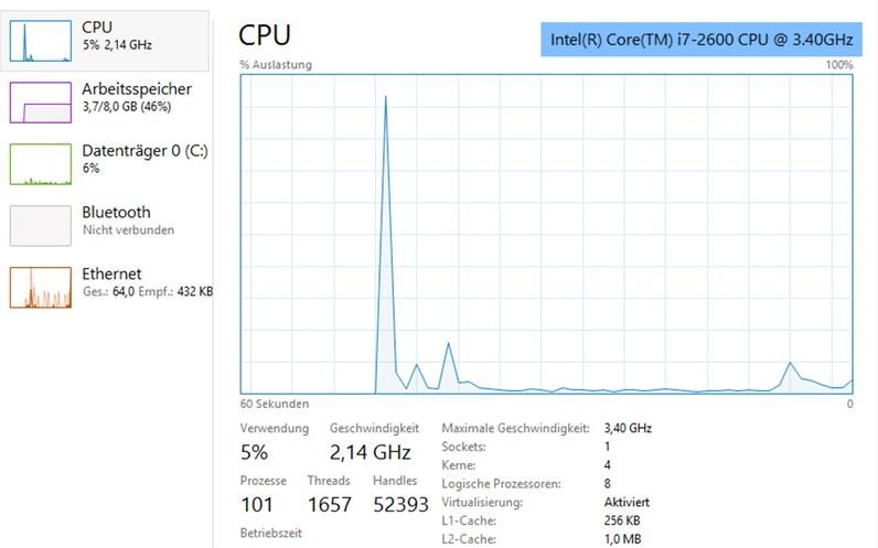 Rufen Sie den Taskmanager auf. Drücken Sie die Tasten [STRG] und [ALT] und [Entf] gleichzeitig. Klicken Sie auf den Taskmanager. Klicken Sie auf den Reiter Leistung. Es wird ein Diagramm mit der Auslastung des Prozessors angezeigt. Darüber finden Sie die Angaben zum Prozessor und zum Modell.