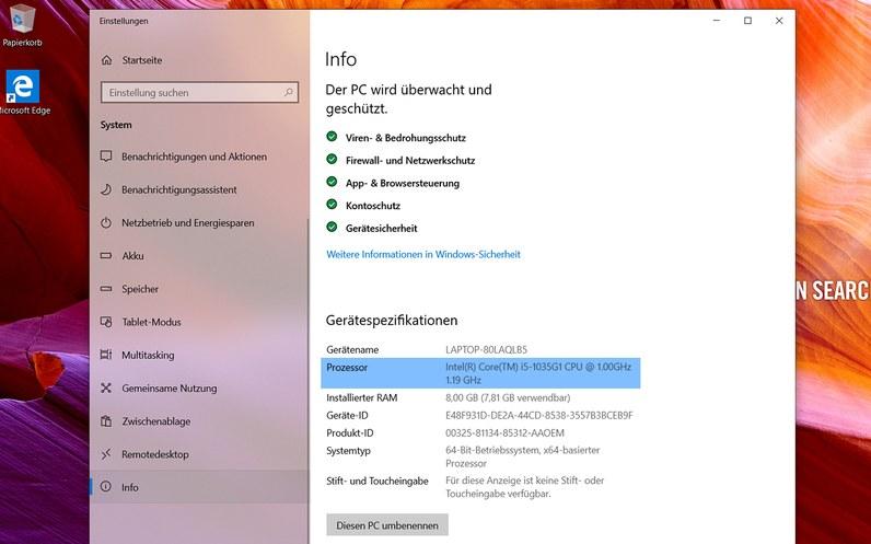 Rufen Sie die Gerätespezifikationen auf. Geben Sie "Prozessor" in das Suchfeld neben dem Windows-Symbol ein, drücken Sie die ENTER-Taste. Das Fenster "Info" wird geöffnet. Hier finden Sie die Gerätespezifikationen mit der Angabe des Prozessors.