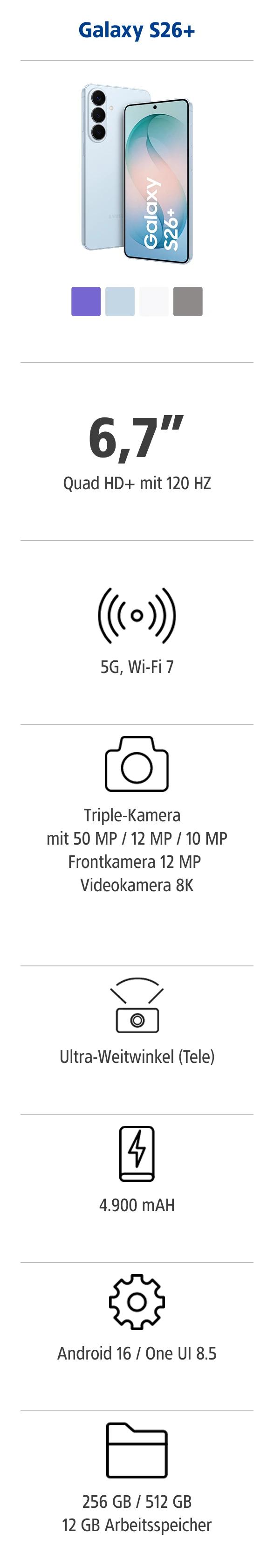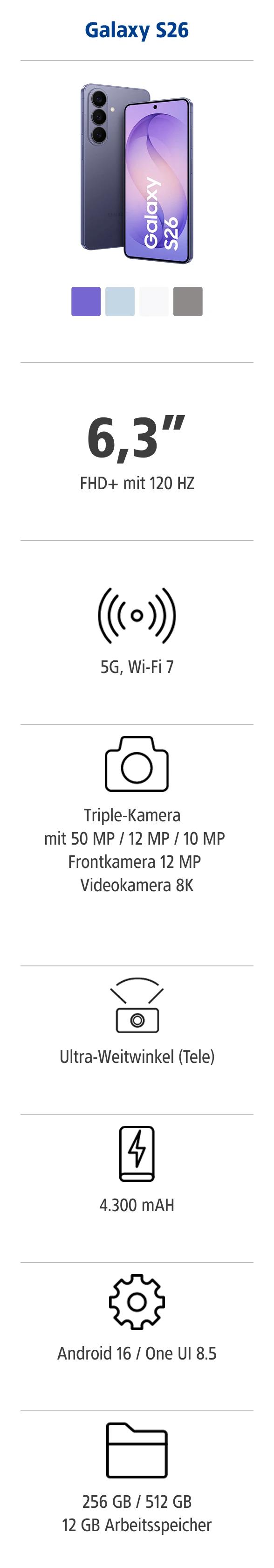 Finden Sie das passende Samsung Galaxy S26 Modell zu Ihrem Tarif.