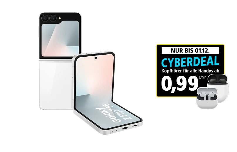 Cyberdeal: Kopfhörer ab 0,99 €/Monat (Kopfhörer geräteabhängig, Abbildung exemplarisch zur Illustration) nur in Verbindung mit einem Vertrag über 24 Monate Mindestvertragslaufzeit mit Smartphone, Tablet oder Laptop, z.B. die Samsung Galaxy Buds3 FE für 0,99 €/Monat Aufpreis mit dem Samsung Galaxy A17 5G in Verbindung mit der 1&1 All-Net-Flat XS für 9,99 €/Mon und mit einer Einmalzahlung von 30,– €, zahlbar bei Vertragsende, spätestens nach 36 Vertragsmonaten. Oder z.B. Apple AirPods 4 für 2,99 €/Monat Aufpreis mit dem iPhone 17 in Verbindung mit der 1&1 All-Net-Flat S für 39,99 €/Mon. und mit einer Einmalzahlung von 300,– €, zahlbar bei Vertragsende, spätestens nach 36 Vertragsmonaten. Sofern der Vertrag nach 36 Monaten noch besteht, wird die Einmalzahlung im 36. Monat automatisch gutgeschrieben, sodass sie sich auf 0,– € reduziert. Die Aktion gilt für Smartphones aller Hersteller sowie ausschließlich für Laptops und Tablets der Hersteller Apple, Samsung und Lenovo.