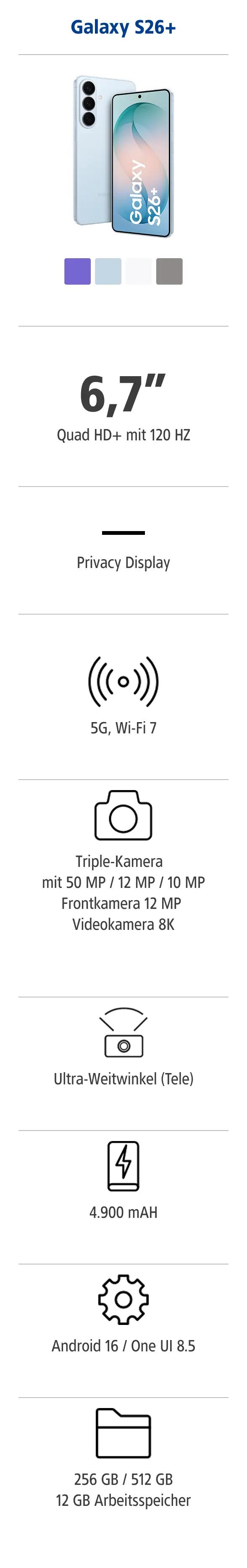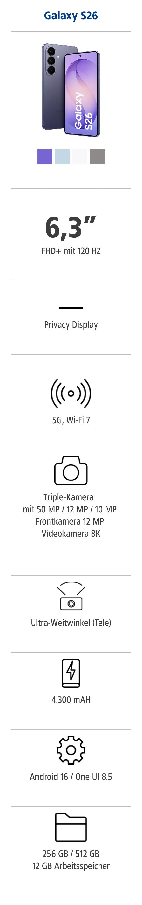 Die aktuelle Samsung Galaxy S26 Reihe des südkoreanischen Herstellers besticht durch superschnelle Prozessoren, starke Akkus, außergewöhnliche Kamera Funktionen und stilvolles Design. Zusätzlich ist natürlich wieder die allerneueste Android-Version als Betriebssystem mit dabei.