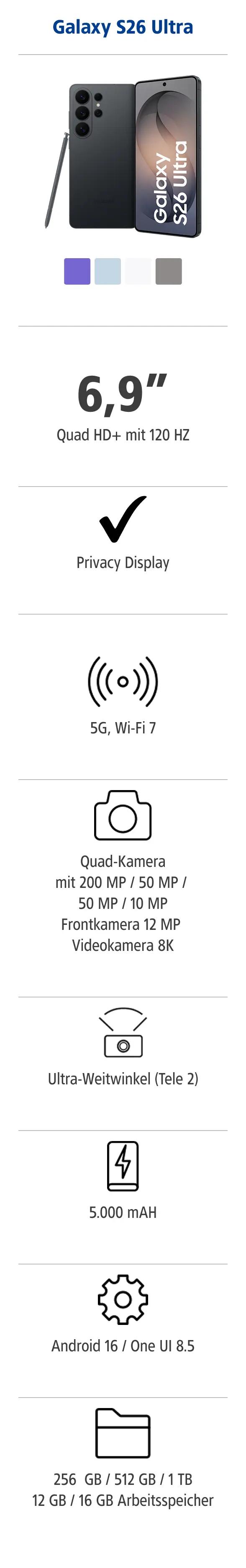 - Modernste Kameras (z.B. Quad Kamera bei S26 Ultra)