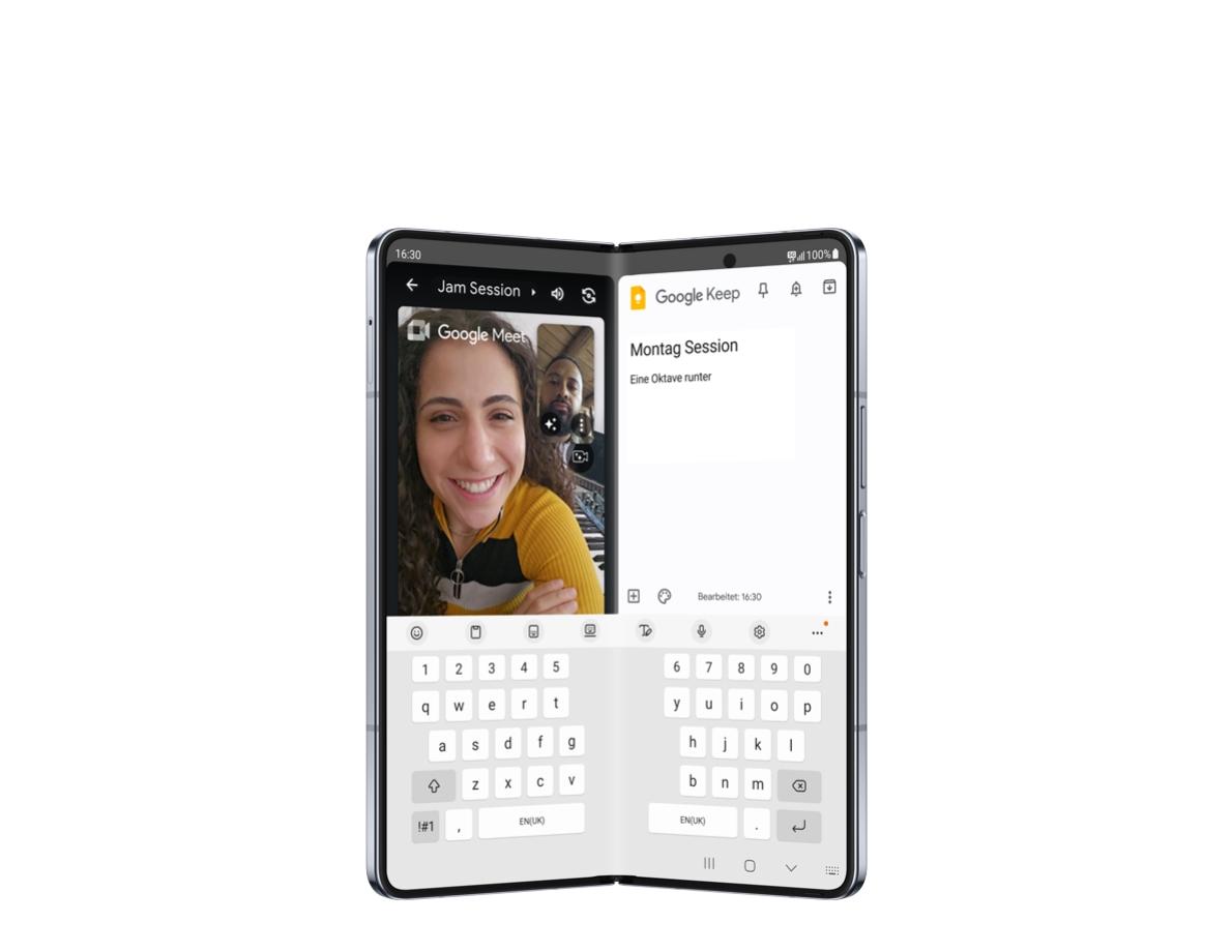 Steigern Sie Ihre Produktivität dank der perfekt für faltbare Smartphones optimierten Apps. Faltbare Smartphones wie das Galaxy Z Fold5 können ganz leicht auf und zugeklappt werden, was ganz neue Möglichkeiten der Nutzung eines Smartphones eröffnet: Für bequemes Multitasking können Sie auf einem großen Bildschirm mehrere Apps gleichzeitig anzeigen und nutzen. Nehmen Sie beispielsweise an Videoanrufen mit Google Meet teil und halten Sie gleichzeitig die wichtigsten Notizen mit Google Keep fest.