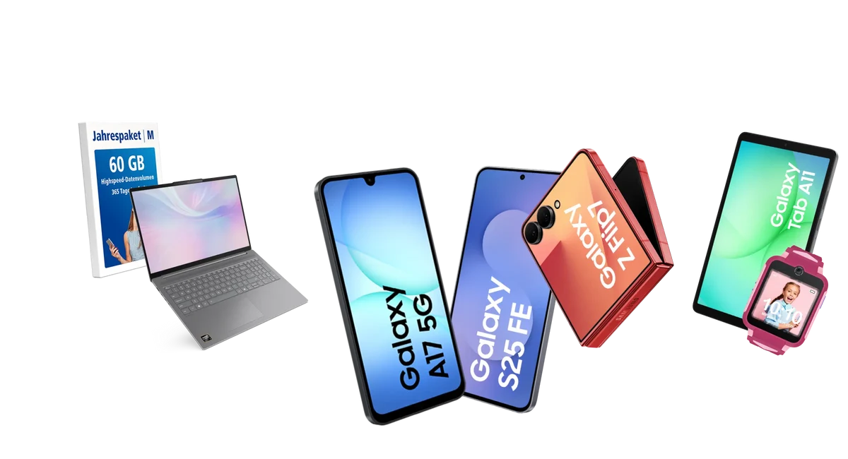 Das Samsung Galaxy A17 5G, das Samsung Galaxy S25 FE oder das Samsung Galaxy Z Flip7, z.B. in Verbindung mit der 1&1 All-Net-Flat S mit Multicard und 10 GB Highspeed-Volumen/Mon. (bis zu 300 MBit/s Download/bis zu 50 MBit/s Upload, danach je max. 64 kBit/s) für dauerhaft 9,99 €/Mon. (A17), 19,99 €/Mon. (S25 FE) bzw. 29,99 €/Mon. (Z Flip7). Mindestvertragslaufzeit je 24 Monate, danach jederzeit kündbar mit 30,‒ € (A17), 150,‒ € (S25 FE) bzw. 270,‒ € (Z Flip7) Einmalzahlung, zahlbar bei Vertragsende, spätestens nach 36 Vertragsmonaten. Oder ohne Einmalzahlung bei Auswahl eines neuen Geräts bei 1&1 und Rücksendung des Altgerätes in gebrauchsfähigem Zustand. Alternativ wird treuen Kunden, sofern der Vertrag nach 36 Monaten noch besteht, die Einmalzahlung im 36. Monat automatisch gutgeschrieben, sodass sie sich auf 0,– € reduziert (Geräterückgabe hierfür nicht erforderlich). Gratis Telefonieren gilt nicht für Sonder- und Premiumdienste, Verbindungen aus Deutschland ins Ausland sowie Roaming außerhalb der EU gemäß Preisliste. Inklusive Telefonate in dt. Fest- und Handynetze sowie Verbindungen innerhalb des EU-Auslands und aus der EU nach Deutschland. Energieeffizienz: S25 FE: B, A17 5G: B, Z Flip7: B. Bereitstellungspreis je 39,90 €. Das Lenovo IdeaPad Slim 5 oder das Samsung Galaxy Tab A11, z.B. in Verbindung mit der 1&1 Daten-Flat S mit 10 GB Highspeed-Volumen/Mon. (bis zu 300 MBit/s Download/bis zu 50 MBit/s Upload, danach je max. 64 kBit/s), für 29,99 €/Mon. (IdeaPad Slim 5) bzw. 14,99 €/Mon. (Tab A11). Mindestvertragslaufzeit je 24 Monate, danach jederzeit kündbar mit 260,‒ € (IdeaPad Slim 5) bzw. 80,‒ € (Tab A11) zahlbar bei Vertragsende, spätestens nach 36 Vertragsmonaten. Oder ohne Einmalzahlung bei Auswahl eines neuen Geräts bei 1&1 und Rücksendung des Altgerätes in gebrauchsfähigem Zustand. Alternativ wird treuen Kunden, sofern der Vertrag nach 36 Monaten noch besteht, die Einmalzahlung im 36. Monat automatisch gutgeschrieben, sodass sie sich auf 0,– € reduziert (Geräterückgabe hierfür nicht erforderlich). Gratis Surfen gilt nicht für Sonder- und Premiumdienste. Eine Nutzung der Datenflatrate für Voice over IP ist nicht gestattet. Energieeffizienz Tab A11: D. Bereitstellungspreis je 39,90 €. Die TCL Kids Watch, z.B. in Verbindung mit 1&1 Kids 1GB mit 1 GB Highspeed-Volumen/Mon. (bis zu 50 MBit/s Download/bis zu 25 MBit/s Upload, danach je max. 64 kBit/s) für 7,99 €/Mon. Telefonie/SMS: 100 Freieinheiten für Telefon-Minuten und/oder SMS pro Monat in alle Fest- und Mobilfunknetze innerhalb Deutschlands, des EU-Auslands und aus EU nach Deutschland plus Island, Liechtenstein und Norwegen. Kostenkontrolle durch voreingestellt gesperrte kostenpflichtige Sonder- und Servicerufnummern der Rufnummerngassen 0900, 0180, 118 und 0137 bei Inlandsnutzung, Premium-Voice/SMS, internationale Verbindungen aus Deutschland ins Ausland sowie Roaming-Verbindungen; Internationale Verbindungen aus Deutschland ins Ausland sowie Roaming-Verbindungen auf Kundenwunsch wieder aktivierbar; Preise gemäß Preisliste. Auf Wunsch inklusive Einrichtungshilfe für Kinderschutz-Apps Google Family Link oder Apple iOS Kinderschutz. Bereitstellungspreis 19,90 €. 24 Monate Mindestlaufzeit. 1&1 Prepaid Jahrespakete z.B. das Jahrespaket S mit 20 GB Highspeed-Volumen/Jahr (bis zu 300 MBit/s im Download/bis zu 50 MBit/s im Upload, nach Verbrauch je max. 64 kBit/s) für 49,99 € einmalig, zahlbar im Voraus. Einmalige SIM-Kartengebühr 29,90 €, inklusive 30 € Startguthaben nach Aktivierung. 12 Monate Mindestvertragslaufzeit. Der Vertrag endet automatisch ohne, dass es einer Kündigung bedarf.  1&1 Einfach-Wechsel: Das Versprechen des reibungslosen Wechsels steht unter technischen Voraussetzungen und Bedingungen. Es gilt nur für Verträge mit 24 Monaten Mindestlaufzeit. Details unter www.1und1.de/DetailsEinfachWechsel. Für alle Angebote gilt: Änderungen und Irrtümer vorbehalten. Preise inkl. MwSt. 1&1 Telecom GmbH, Elgendorfer Straße 57, 56410 Montabaur.